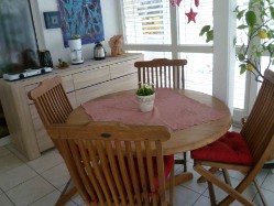 Unterkunft Ferienwohnung mit geschmackvoll eingerichtetem, ruhigem Gästezimmer, das ausgestattet ist mit einem Doppelbett und zusätzlicher Schlafcouch für zwei Personen, separater Dusche/WC; separatem, eigenem Eingang, Wintergarten und gemütlichem Kaminzimmer. Falls Sie als Gruppe oder z.B. mit zwei Familien kommen, stehen weitere Schlafmöglichkeiten im Studio im Obergeschoss für Sie bereit. Im Wintergarten besteht die Möglichkeit der Zubereitung von Mahlzeiten. Ein 2-Platten-E-Herd, Mikrowelle mit integriertem Backofen, Wasserkocher, Eierkocher, Toaster und Kaffeemaschine sind vorhanden. Ebenso Töpfe, Gläser, Besteck und Geschirr. Sat-TV und WLAN können kostenlos genutzt werden.